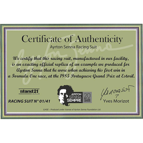 Produced by Stand 21 under the watchful eye of Yves Morizot, founding president of the company who in 1987, personally looked after the development of the Brazilian champion’s personal equipment, this edition limited to 30 copies and manufactured in accordance with the period’s standards, comes inside a beautiful wooden frame protected by safety glass.